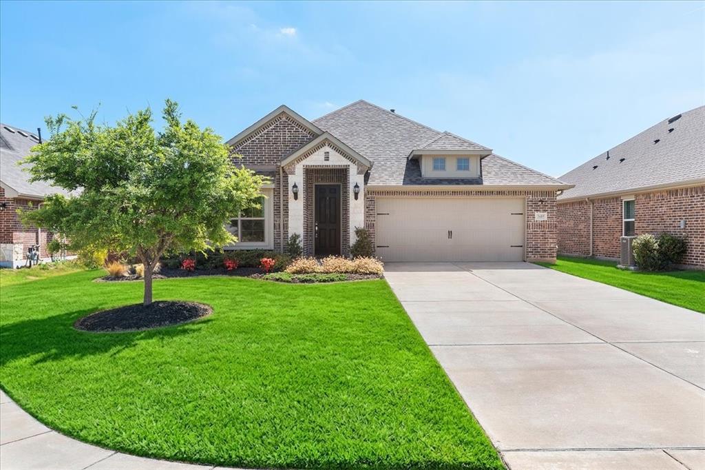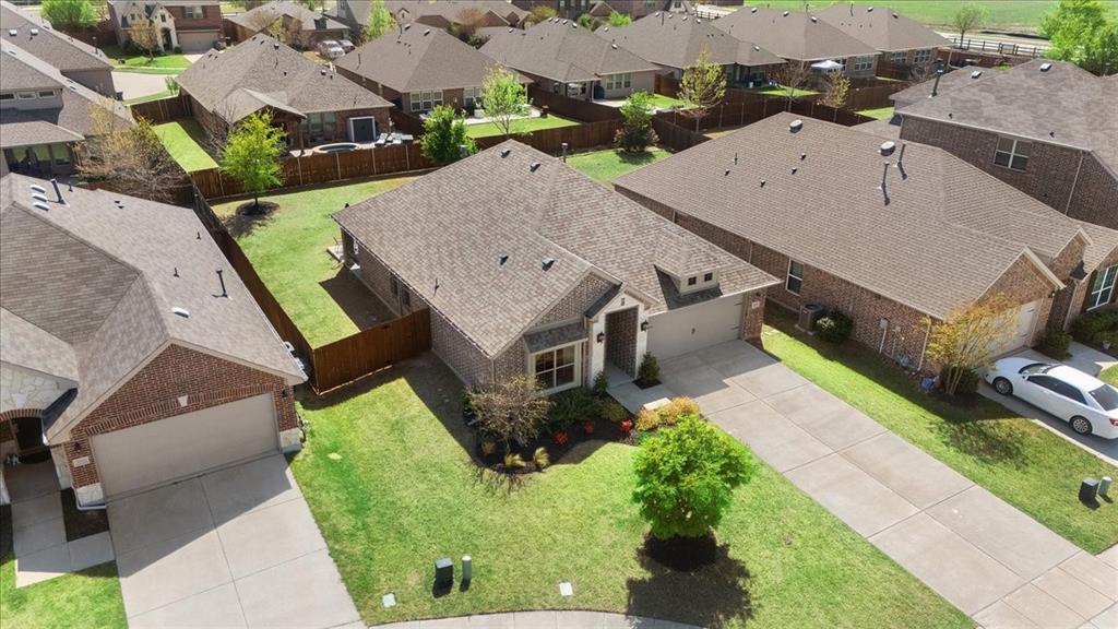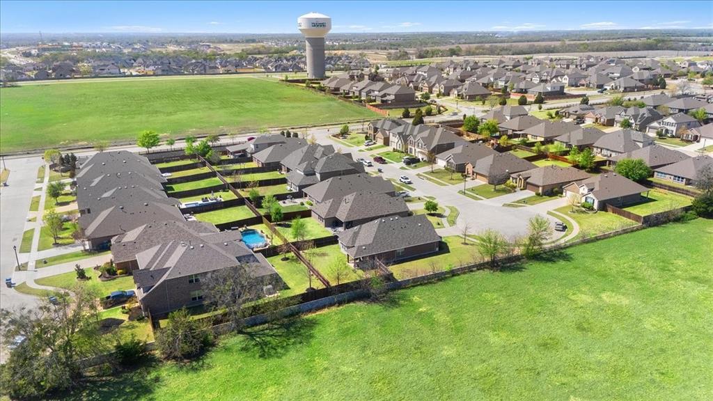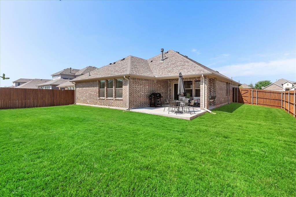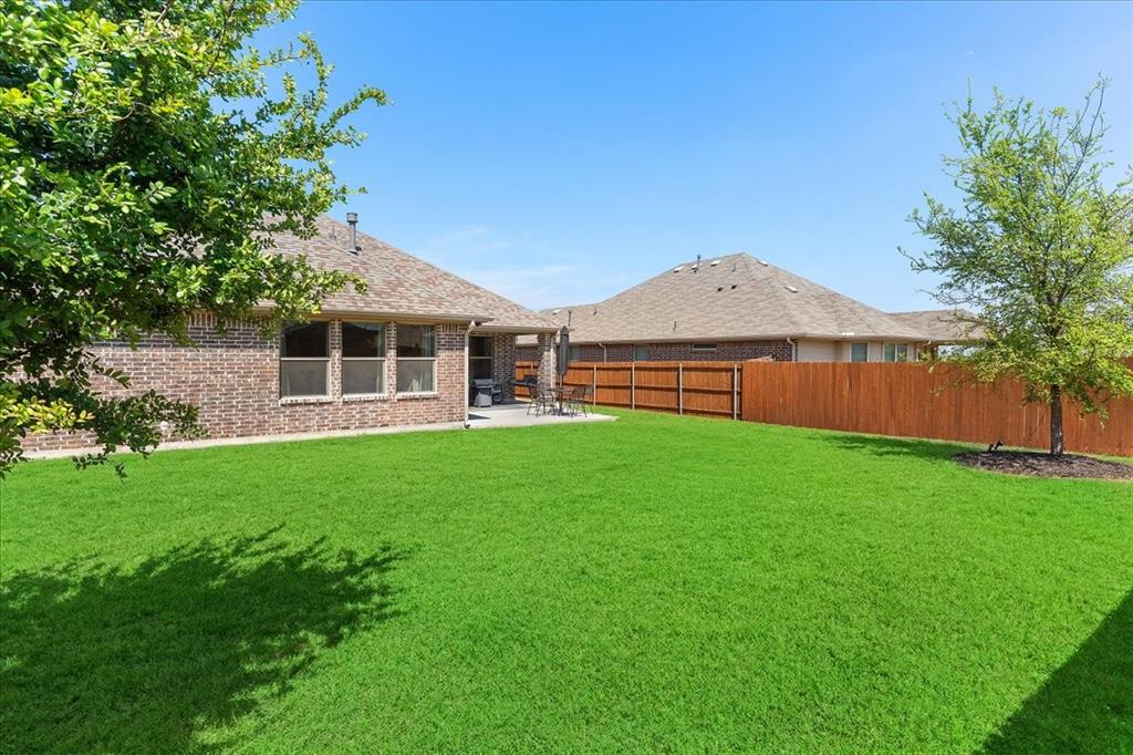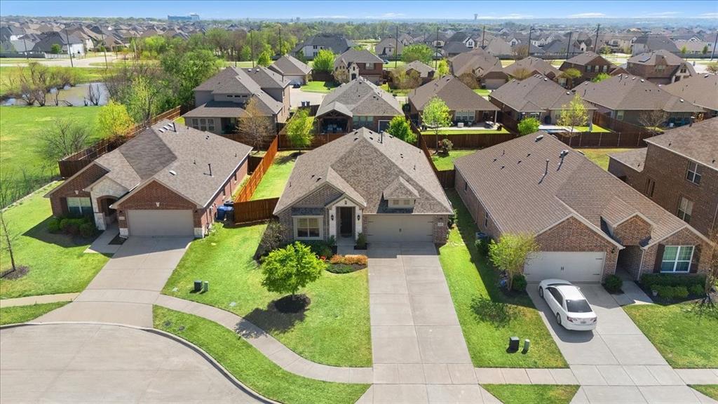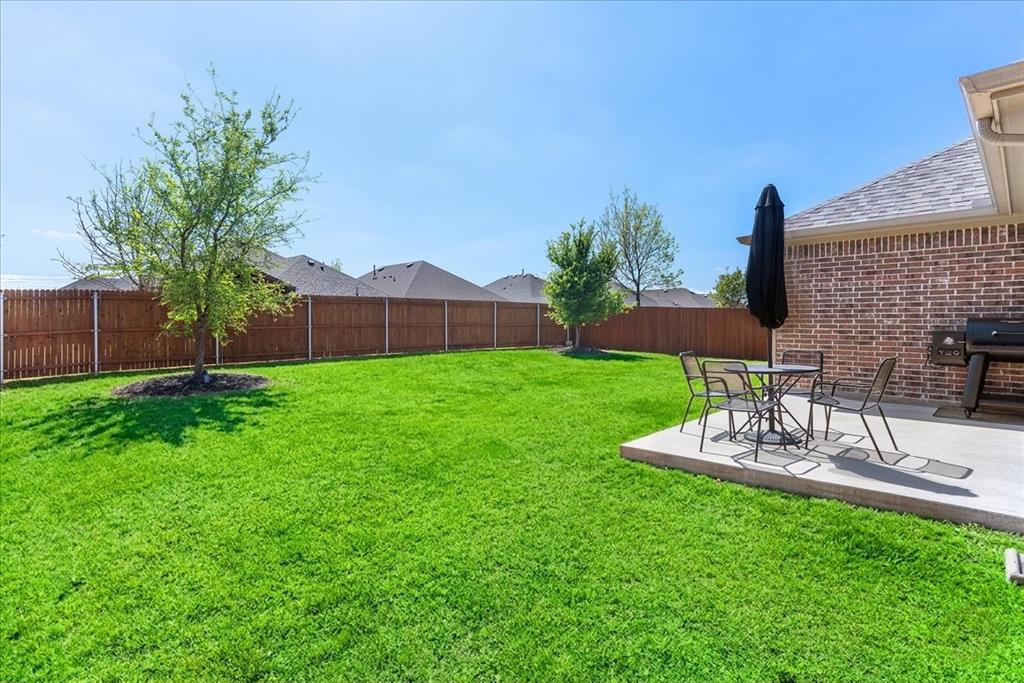 Multiple offers: Best and final by Tues. April 14th 12pm. Best & final Welcome to this beautifully designed home in the highly sought-after Erwin Farms community in McKinney! This fully brick home with stone accents offers incredible curb appeal and is nestled on a quiet cul de sac with serene views of a neighboring farm field, complete with grazing cows and a peaceful pond. It features 3 bedrooms, 2 bathrooms, and a spacious office or flex room, perfectly blending functionality with modern style. Step inside to an open-concept layout filled with natural light, ideal for both everyday living and entertaining. The stunning kitchen features crisp white cabinetry, a decorative white subway tile backsplash, stainless steel appliances, light quartz countertops, and a large island with ample prep and seating space. The kitchen flows seamlessly into the dining and living areas, where you’ll find a gorgeous tile fireplace with a wood mantel creating a warm and inviting focal point. Wood-look tile flooring runs throughout the main living, areas offering both durability and style. The spacious primary suite overlooks the backyard and provides a peaceful retreat. The ensuite bathroom includes dual sinks, a soaking tub, and a large walk-in shower with decorative tile details. This home also includes thoughtful upgrades such as a tankless water heater, smart garage door system, built-in pest control system, and gutters installed around the entire home for added convenience and efficiency. Step outside to enjoy the oversized backyard from the covered patio, offering one of the largest yards on the market for a home like this in McKinney. This pool-sized yard provides plenty of space to relax, play, or entertain. Located in Erwin Farms, residents enjoy access to a community pool, playground, scenic walking trails, and are just minutes from Highway 75, Highway 121, downtown McKinney, and an abundance of dining, shopping, and entertainment options.