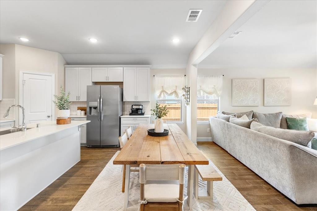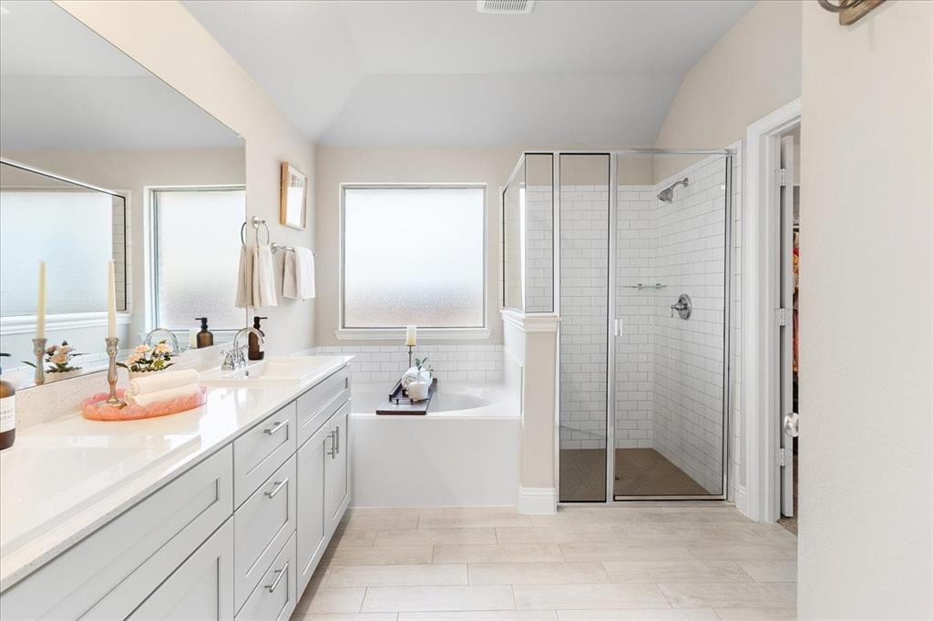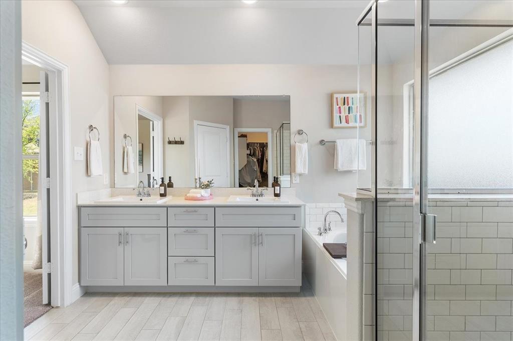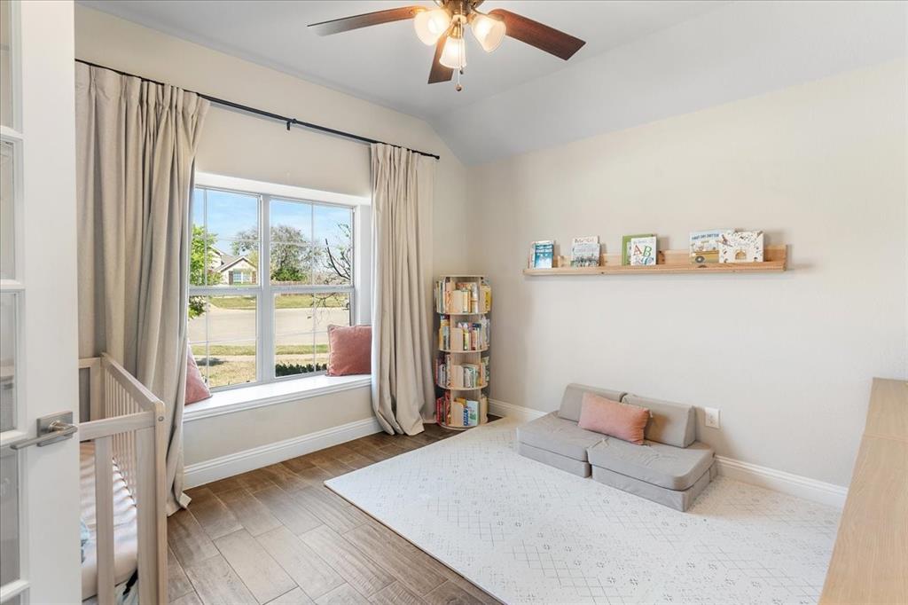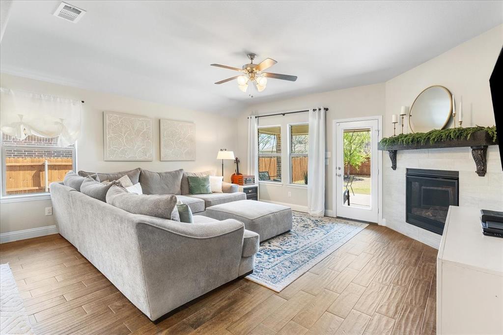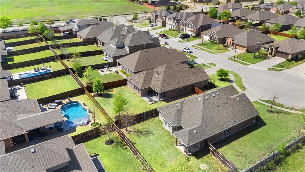 Multiple offers: Best and final by Tues. April 14th 12pm. Best & final Welcome to this beautifully designed home in the highly sought-after Erwin Farms community in McKinney! This fully brick home with stone accents offers incredible curb appeal and is nestled on a quiet cul de sac with serene views of a neighboring farm field, complete with grazing cows and a peaceful pond. It features 3 bedrooms, 2 bathrooms, and a spacious office or flex room, perfectly blending functionality with modern style. Step inside to an open-concept layout filled with natural light, ideal for both everyday living and entertaining. The stunning kitchen features crisp white cabinetry, a decorative white subway tile backsplash, stainless steel appliances, light quartz countertops, and a large island with ample prep and seating space. The kitchen flows seamlessly into the dining and living areas, where you’ll find a gorgeous tile fireplace with a wood mantel creating a warm and inviting focal point. Wood-look tile flooring runs throughout the main living, areas offering both durability and style. The spacious primary suite overlooks the backyard and provides a peaceful retreat. The ensuite bathroom includes dual sinks, a soaking tub, and a large walk-in shower with decorative tile details. This home also includes thoughtful upgrades such as a tankless water heater, smart garage door system, built-in pest control system, and gutters installed around the entire home for added convenience and efficiency. Step outside to enjoy the oversized backyard from the covered patio, offering one of the largest yards on the market for a home like this in McKinney. This pool-sized yard provides plenty of space to relax, play, or entertain. Located in Erwin Farms, residents enjoy access to a community pool, playground, scenic walking trails, and are just minutes from Highway 75, Highway 121, downtown McKinney, and an abundance of dining, shopping, and entertainment options.