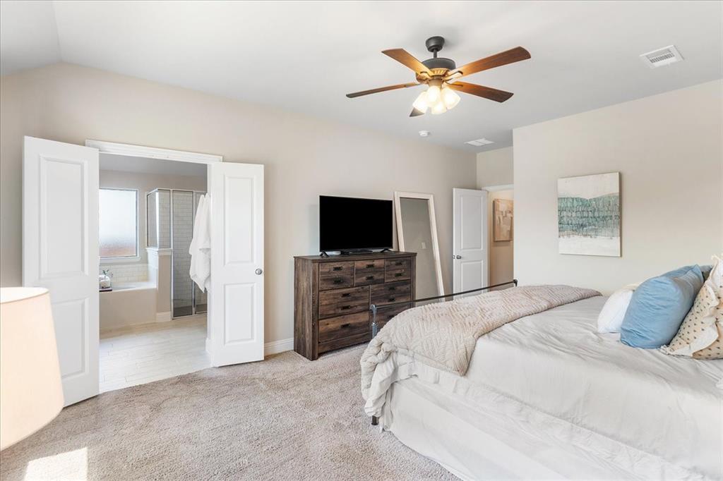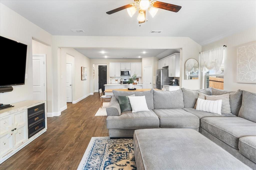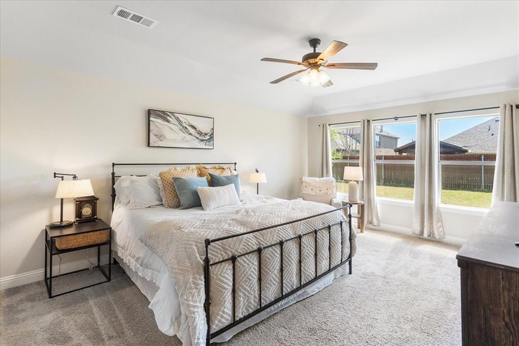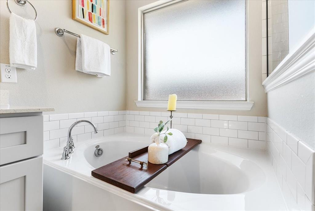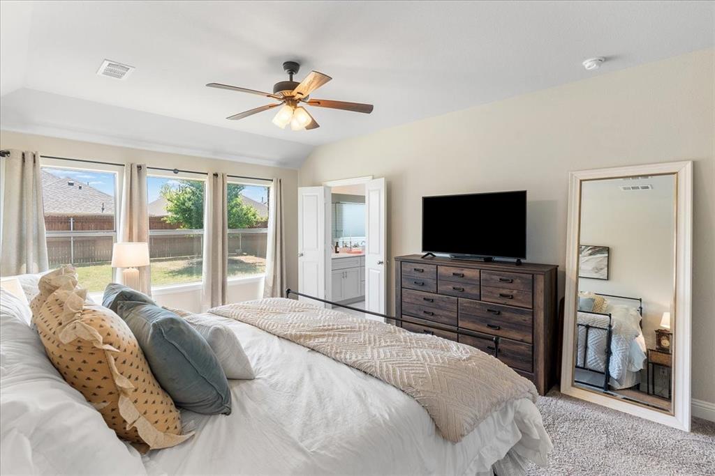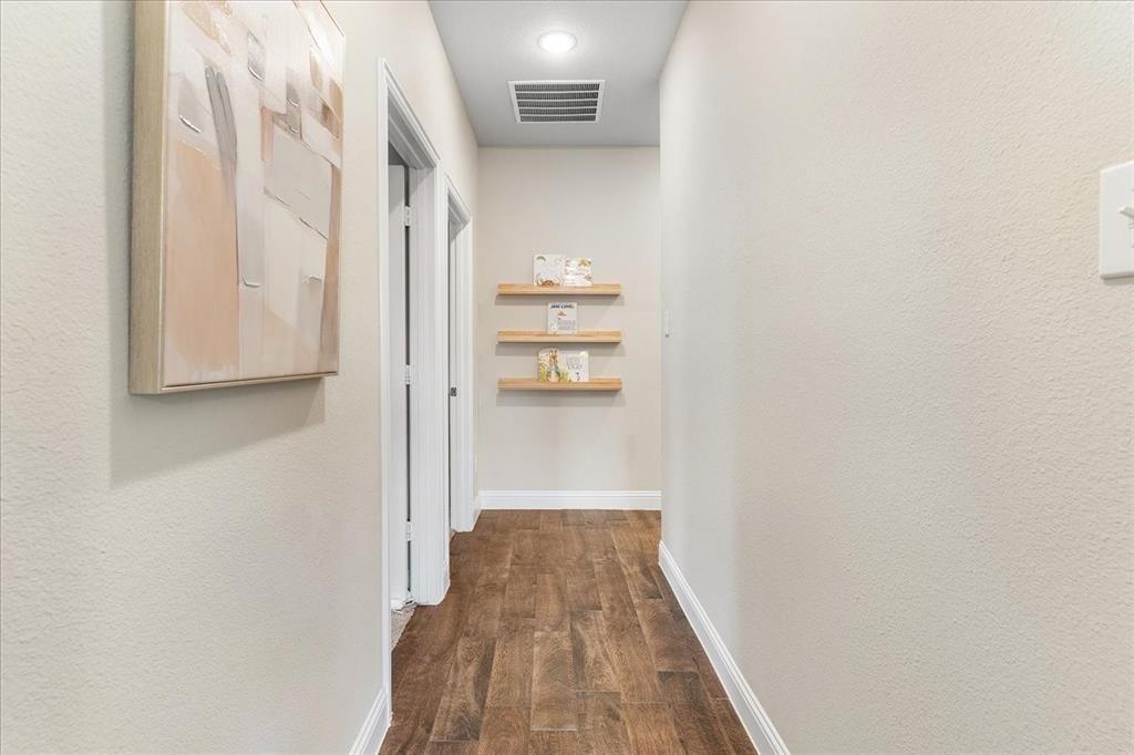 Multiple offers: Best and final by Tues. April 14th 12pm. Best & final Welcome to this beautifully designed home in the highly sought-after Erwin Farms community in McKinney! This fully brick home with stone accents offers incredible curb appeal and is nestled on a quiet cul de sac with serene views of a neighboring farm field, complete with grazing cows and a peaceful pond. It features 3 bedrooms, 2 bathrooms, and a spacious office or flex room, perfectly blending functionality with modern style. Step inside to an open-concept layout filled with natural light, ideal for both everyday living and entertaining. The stunning kitchen features crisp white cabinetry, a decorative white subway tile backsplash, stainless steel appliances, light quartz countertops, and a large island with ample prep and seating space. The kitchen flows seamlessly into the dining and living areas, where you’ll find a gorgeous tile fireplace with a wood mantel creating a warm and inviting focal point. Wood-look tile flooring runs throughout the main living, areas offering both durability and style. The spacious primary suite overlooks the backyard and provides a peaceful retreat. The ensuite bathroom includes dual sinks, a soaking tub, and a large walk-in shower with decorative tile details. This home also includes thoughtful upgrades such as a tankless water heater, smart garage door system, built-in pest control system, and gutters installed around the entire home for added convenience and efficiency. Step outside to enjoy the oversized backyard from the covered patio, offering one of the largest yards on the market for a home like this in McKinney. This pool-sized yard provides plenty of space to relax, play, or entertain. Located in Erwin Farms, residents enjoy access to a community pool, playground, scenic walking trails, and are just minutes from Highway 75, Highway 121, downtown McKinney, and an abundance of dining, shopping, and entertainment options.